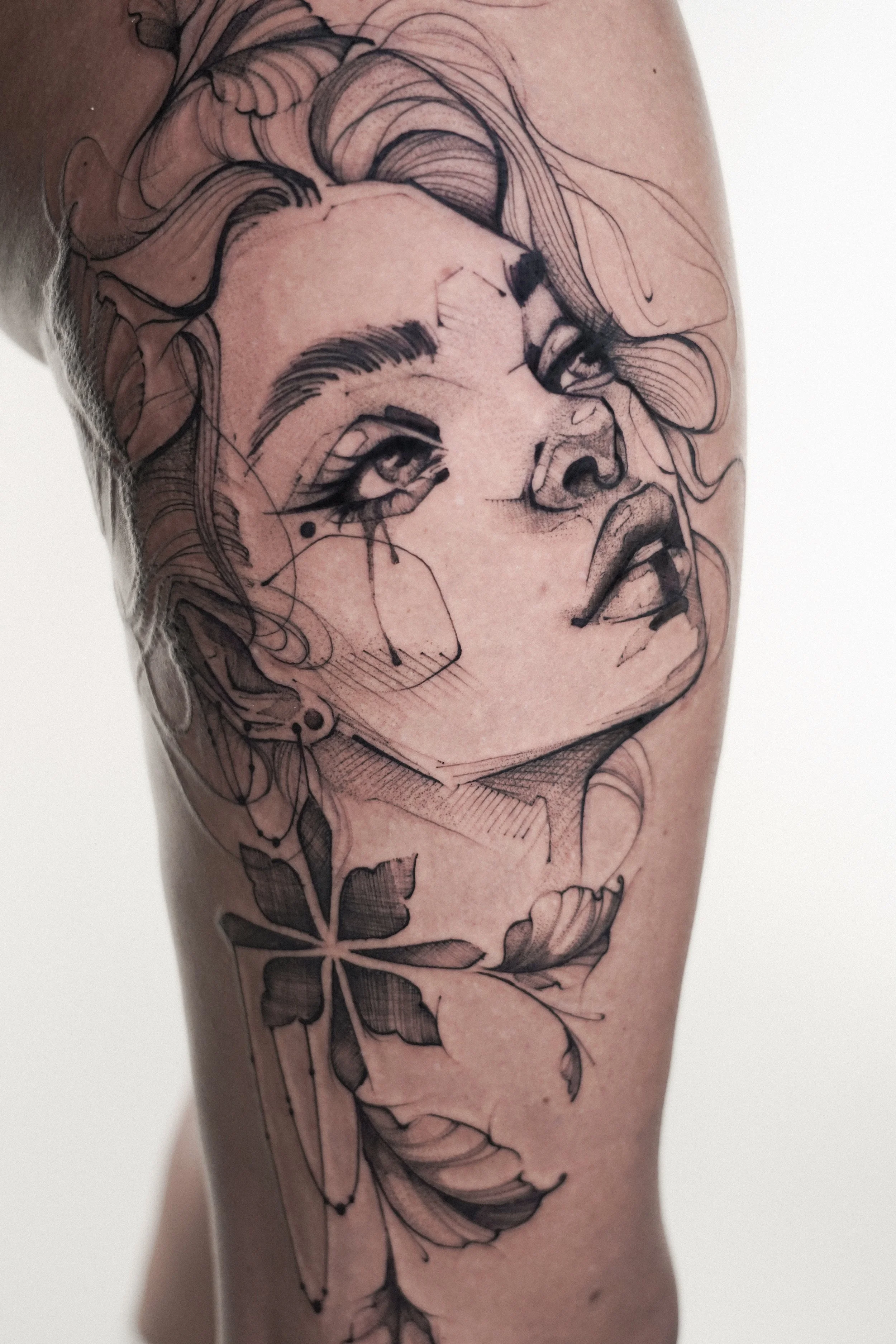 Mein Fokus liegt auf ausdrucksstarken Frauenporträts, mythologischen Wesen und fein gearbeiteten Tiermotiven. Jedes Tattoo entsteht in enger Zusammenarbeit mit meinen Kund*innen – maßgeschneidert, bedeutungsvoll und technisch präzise.